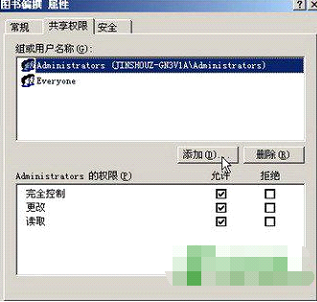 第2步,打开“图书编撰 属性”对话框,切换到“共享权限”选项卡,并单击“添加”按钮,如图所示。