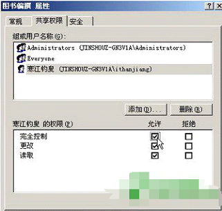 第4步,返回“图书编撰 属性”对话框,在“共享权限”选项卡中选中刚刚添加的用户(如“寒江钓叟”)。然后在“寒江钓叟 的权限”列表中选中“完全控制 允许”复选框,并单击“应用”按钮,如图所示。