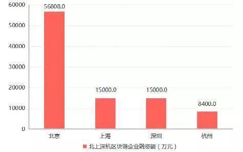 从融资规模看,北京12家区块链公司累计获得融资额达到56808万元,上海2家区块链公司共计获得15000万元融资,深圳1家区块链公司获得15000万元融资,杭州6家区块链公司获得8400万元融资。