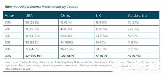 在论文发表数量上,2015年中国学者在AAAI上发表的论文为138项,占据全世界的20.5%;而来自美国学者发表的成果数量为326项,占全世界的48.4%。