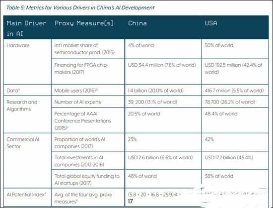 报告据此得出结论,称中国硬件水平远不及美国,已经成为人工智能发展的瓶颈。
