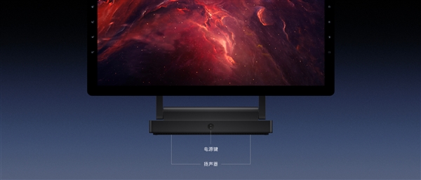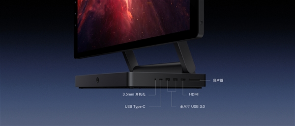 底座前方,是居中的电源键和左右两个扬声器,右侧分布着3.5mm耳机孔、USB Type-C、两个USB 3.0、HDMI、扬声器,左侧是HDMI-DP信号源切换器、USB Type-C、两个USB 3.0、DisplayPort、扬声器。