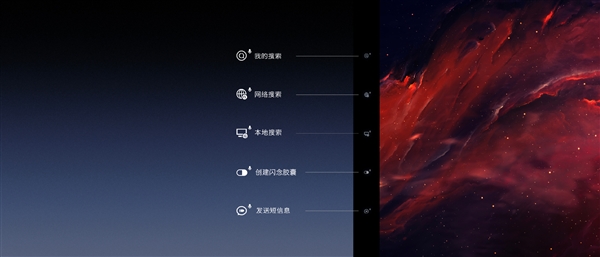 屏幕顶部居中排列着500万像素前置摄像头(支持Face++人脸解锁)、环境光传感器、双数字麦克风,左右两侧分布着十个虚拟按键,其中左边是我的搜索、网络搜索、本地搜索、创建闪念胶囊、发送短消息五个按钮,右侧则是相册、文件管理器、快捷短语和剪切板、闪念胶囊队列、截图工具。