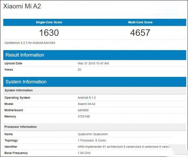小米A2手机在Geekbench数据库遭到曝光
