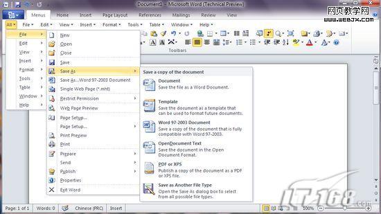 以后,我们运行任意一个Office 2010的组件时,都可以看到我们所熟悉的菜单栏和工具栏,效果如图2所示,不仅菜单和工具栏显示区已经转变成Office 2003的形式,而且Office 2010新增加的特征也被自动整合至主菜单和工具显示区,感兴趣的朋友可以一试。