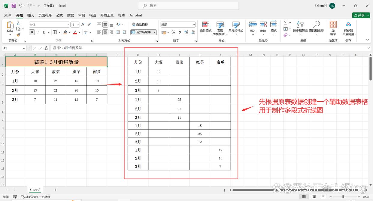 1、打开Excel表格,先根据原表数据创建一个辅助数据表格(如图2),用于制作多段式折线图。