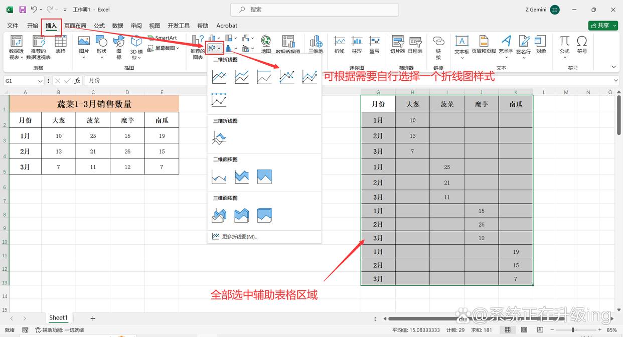 2、全部选中辅助表格区域,点击【插入】-【折线图】(可根据需要自行选择一个折线图样式),这样就成功添加一个折线图(多段式)。