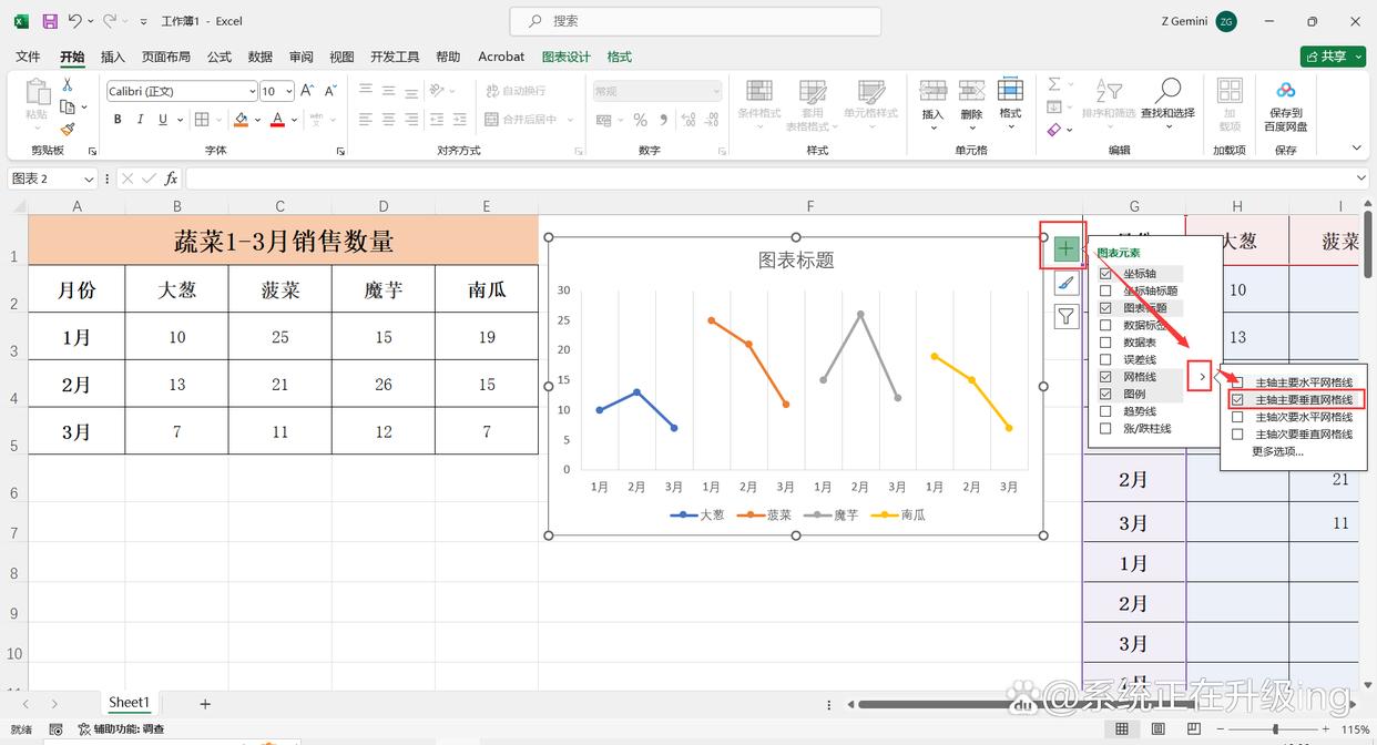 3、选中图表,点击图表右上角+号(图表元素),点击【网格线】,将【主轴主要水平网格线】取消勾选,将【主轴主要垂直网格线】勾选。