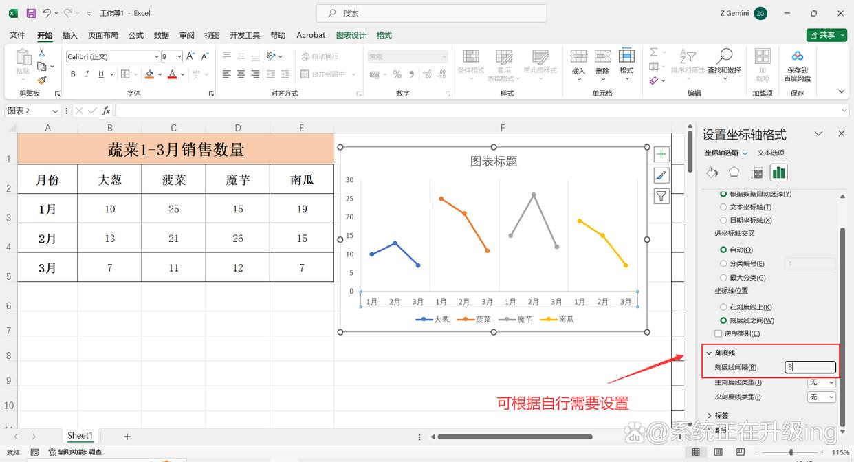 4、点击选中图表中的垂直网格线,单击鼠标右击点击【设置坐标轴格式】,在弹出的“设置坐标轴格式”对话框中点击【刻度线】,将【刻度线间隔】设置为:3(可根据自行需要设置),这样多段式折线图就制作完成了。在自行调整位置即可。