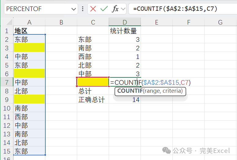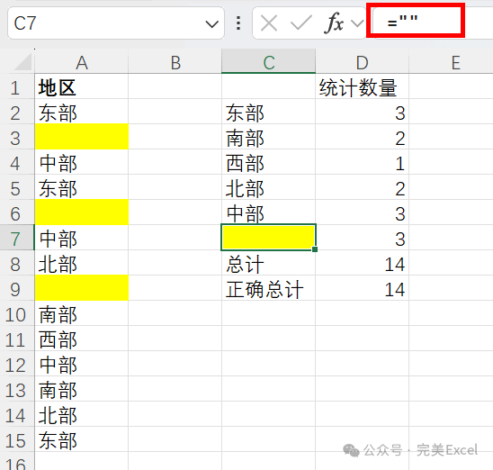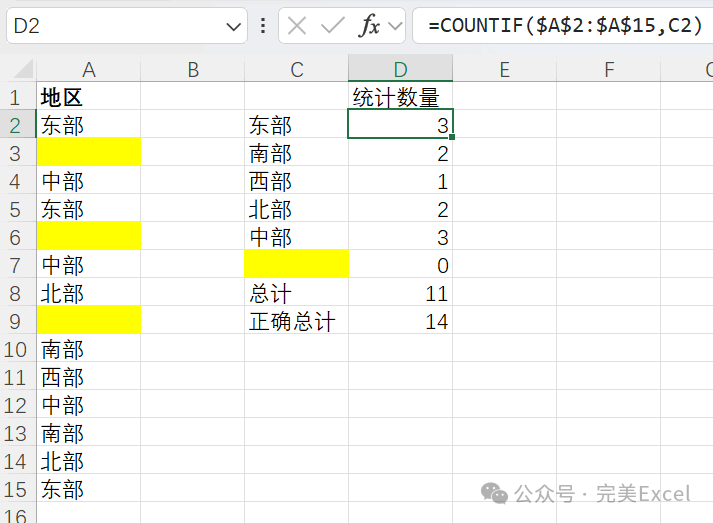 有时候,Excel不能正确处理空白单元格。如下图1所示,左侧列A中存在一些空白单元格,它们均已被标记为黄色背景色;右侧列D中使用COUNTIF函数来统计各地区和空白单元格的数量。