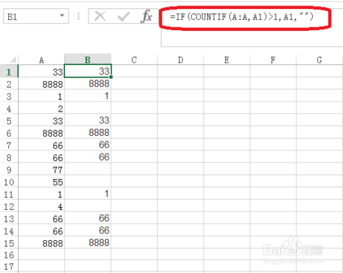 如图所示,输入公式=IF(COUNTIF(A:A,A1)>1,A1,"")