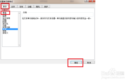 3、在选择“数字”后点击“常规”确定,Excel 表格中文字就能正常显示。