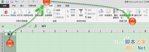 首先,在A列上方插入光标选中A列,在excel的菜单栏切换到“数据”选项卡,找到“数据工具”菜单组。