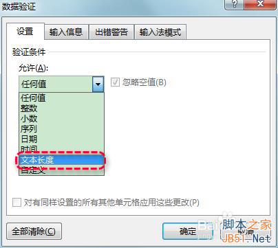 目的是要限定A列输入的文本个数,所以在“设置”选项卡的验证条件“允许”里面选择“文本长度”。