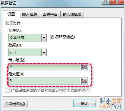 文本长度下“数据”处选择“介于”,“最大值”与“最小值”均填写5。
