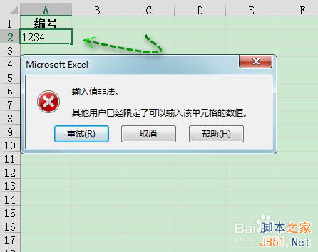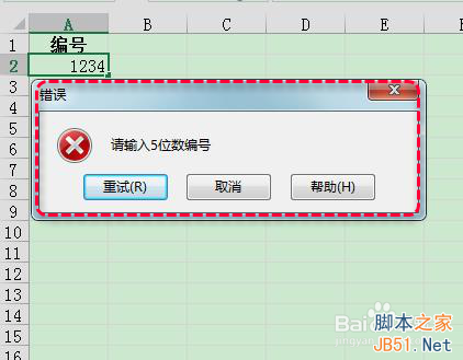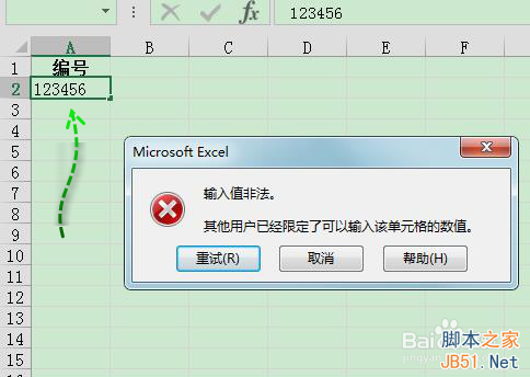 确定后试试在A列输入“123456”不会成功并弹出错误警告。