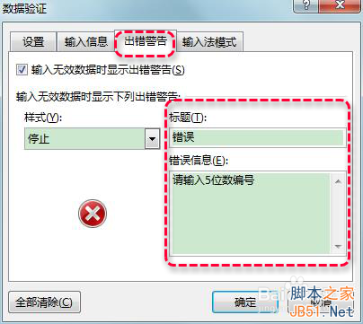 其实,错误警告的内容是可以自行设置的,如图,还是在“数据验证”,切到“出错警告”选项卡,然后自行填写警告标题与内容就可以了。比如小编填写“标题:错误 内容:请输入5位数编号”。