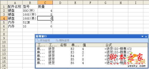 2、在“销售”工作表中输入或修改“数量”单元格中数据的同时,就能同时在“监视窗口”中看到“进货”工作表中“未售数量”单元格的数值变化了。(如图3)