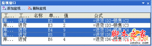3、添加的监视单元格用完后,可以按住一个Ctrl键,再使用鼠标在“监视窗口”中分别单击要删除的单元格,然后单击“删除监视”按钮或按Del键,就能把添加的监视单元格删除了。(如图4)