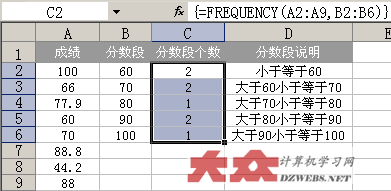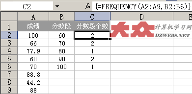 如上图一样,首先选中C2:C6这个范围的单元格,然后在FX函数输入栏中,输入公式: =FREQUENCY(A2:A9,B2:B6 然后,一起按下Ctrl+Shift+Enter这三个键,这样,上面的公式就自动变成 {=FREQUENCY(A2:A9,B2:B6} 多了一对大括号,注意哦,这对大括号不是通过键盘直接输入的,而是通过刚才的Ctrl+Shift+Enter这三个键按出来的。