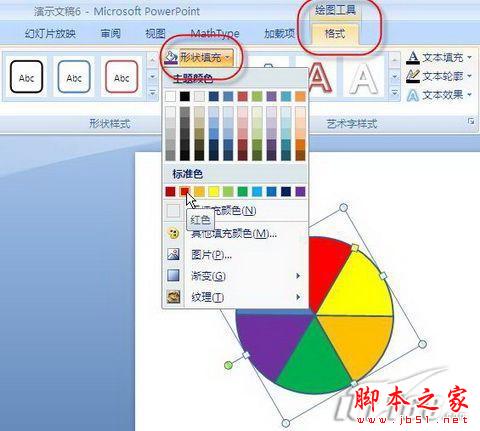 现在要做的,那就是选中一个扇形,然后点击功能区“绘图工具”下的“格式”选项卡“形状样式”功能组“形状填充”按钮旁边的小三角形,在弹出的菜单中为扇形指定颜色,如图4所示。其它几个扇形照此办理。