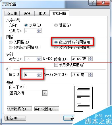 6、接下来是设定每页行数,同样的操作,选择word菜单栏中的“文件”-“页面设置”-“文档网络”,选择“指定行和字符网格”然后在“行”中输入每页的行数,如图所示,确定之后回到页面可以看到设定成功。