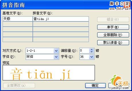我们现在来增加难度:如果想让多个汉字的拼音出现在随后的一个括号里,怎么办呢?这需要在“拼音指南”对话框中进行设置,单击“组合”按钮,原来单个的汉字即集中在一个文本框中,拼音集中在对应的另一个文本框中。下面我们就能对它们动手术了,可以在拼音框添加注解文字,还可以在各字音间添加空格,以避免将来拼音之间距离过近。如图6。