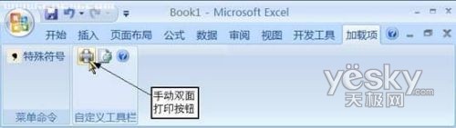 安装ExcelPrinter后,再打开Excel2007切换到“加载项”选项,你会发现比原来多出了“手动双面打印”和“打印当前页”这两项工具按钮(图2)。单击“手动双面打印” ,效果就和Word中的双面打印一样,会在打印完单页内容后弹对话框提醒你换一面,确定后再打印出双页内容。