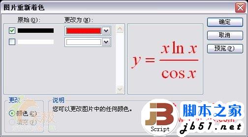 因为公式编辑器输入的数学公式是以图片形式出现在文档中的。所以我们可以像修改图片一样修改它。在PowerPoint执行“视图→工具栏→图片”命令,展开“图片”工具栏。选中要变换颜色的公式,然后单击“图片重新着色”按钮,打开“图片重新着色”对话框。为公式设置一种颜色,确定返回即可 (如图2)。