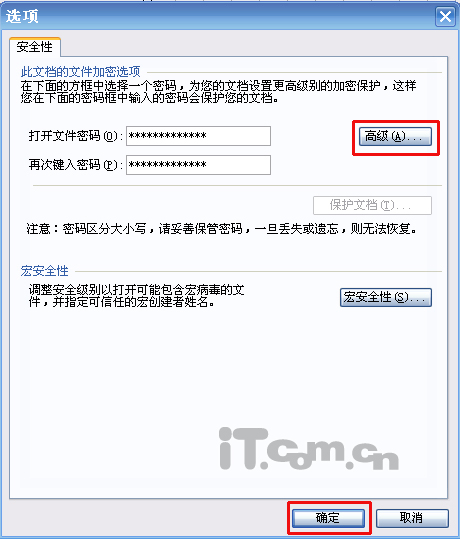 此时会调出一个选项窗口,你可以直接输入自己的密码,按确定按钮就搞定,系统会自动按照默认的密码标准为你加密,如果你觉得还不放心的话,你可以点击高级选项,选择其他的密码标准,如图2、图3所示: