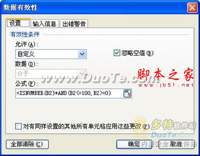 公式含义:ISNUMBER(B2)表示必须是数字,AND(B2<=100,B2>=0)表示数据必须在0-100之间;两个条件中用*号连接表示必须同时满足两个条件。