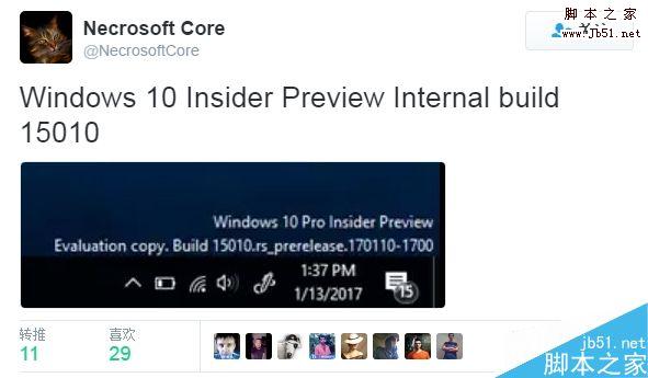 晒出Build 15010的是微软消息知名爆料人Necrosoft Core,它拿到的一台电脑刷上了Build 15010,但是内部分支,还处于评估阶段,而Build Feed上则出现了更新的Build 15012,预计最快本... 17-01-16