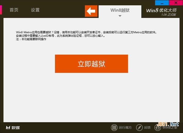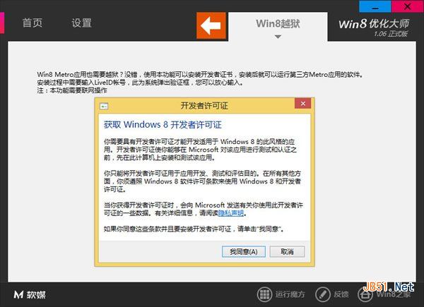 特向大家推荐软媒的Win8优化大师中的越狱功能,它可以帮助Win8用户(x86架构)部署没在Windows应用商店上架的应用。另外,当Win8开发者证书许可证到期时,你所安装的越狱应用将无法使用,此时请使用Win8优化大师再次进行Win8越狱。