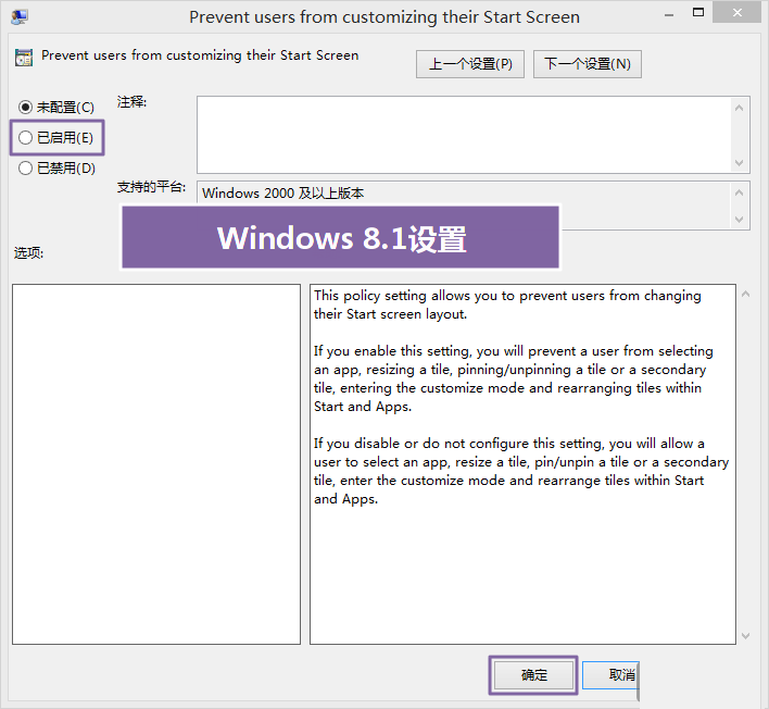 备注:由于Windows 8.1有可能没有汉化完全,所以该项有可能是全英文显示,即Prevent users from customizing their Start Screen。