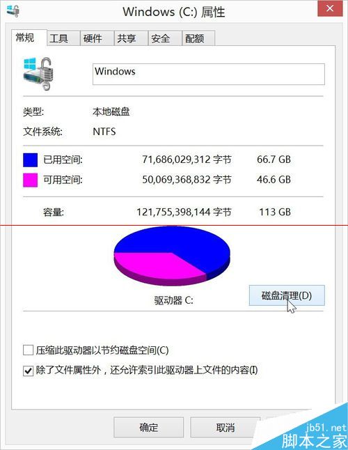 3、这个时候会看到属性的窗口,不用转换顶上的页签,在当前的页面选择“磁盘清理”,点击进入;