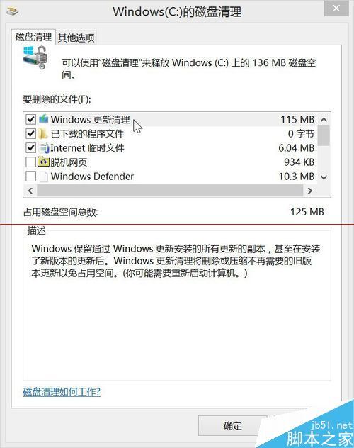 7、最后,扫描结束后,就进入到了另外一个类似的界面,但是里面的内容确实完全不一样了,看到了么?“Windows更新清理”,选中它,然后点击“确定”,即可开始清理的进度,这个进度视你的更新文件大小而定,稍后片刻即可。