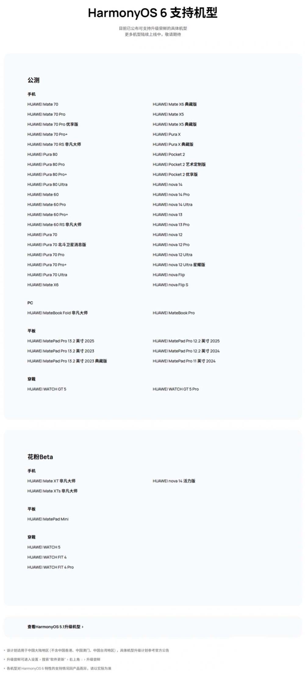 我们注意到,华为官网已更新 HarmonyOS 6 支持机型情况:MatePad Pro 12.2 英寸 2025 款平板、WATCH GT 5 系列手表等开放了鸿蒙 6 系统的公测升级;nova 14 活力版手机、MatePad Mini 小平板、WATCH FIT 4 系列手表开启了花粉 Beta 版本尝鲜升级。具体如下: