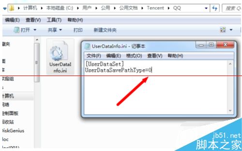 3、接着再进入“QQ文档”目录,将其中的“UserDataInfo.ini”文件进行编辑,将文件内容“UserDataSavePathType”属性设置为“0”,并点击“文件”-“保存”项,保存此配置文件后退出。最后再尝试登陆QQ程序。