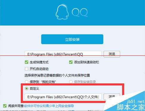 2、从打开的“自定义选项”界面中,勾选“选择保存消息记录数据文件的个人文件夹保存位置”栏目中的“自定义”选项,同时设置“个人文件夹保存位置”。点击“立即安装“按钮。