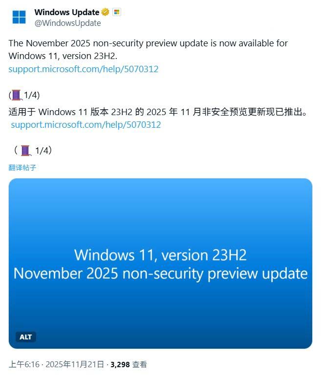 科技媒体 NeoWin 昨日(11 月 20 日)发布博文,报道称微软面向 Windows 11 23H2 系统,推送了 11 月可选更新 KB5070312,用户安装后版本号升至 Build 22631.6276。