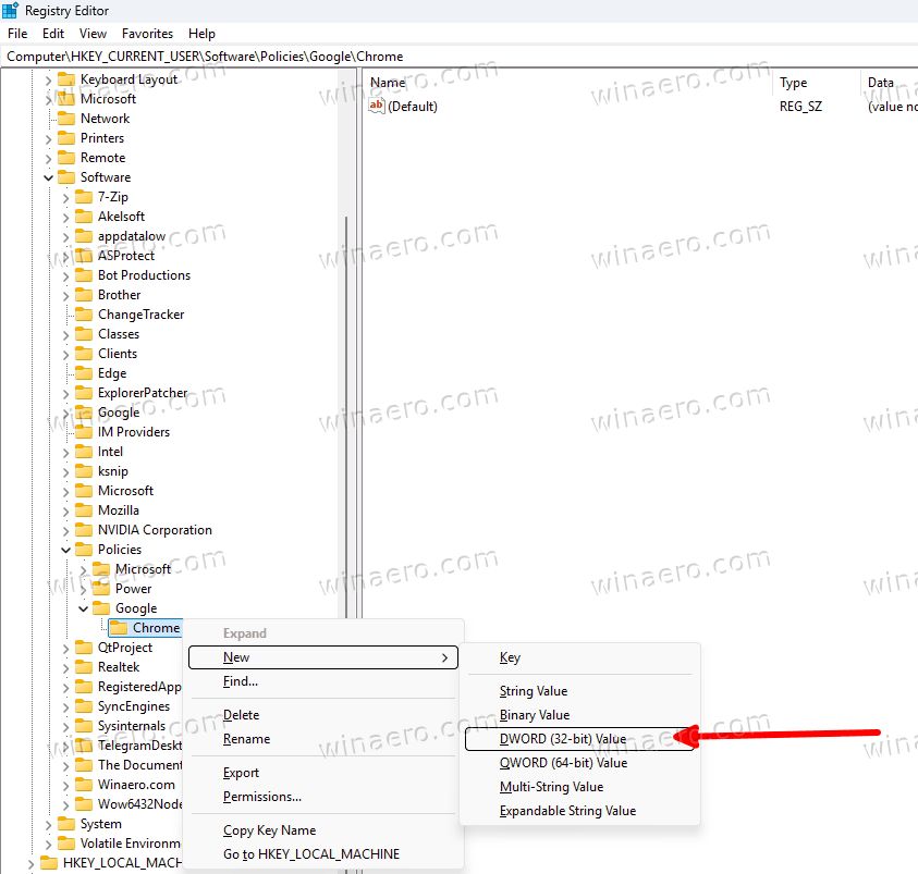 5、在左侧窗格中右键单击 Chrome 项,然后在菜单中选择“新建 > DWORD(32 位)值”。