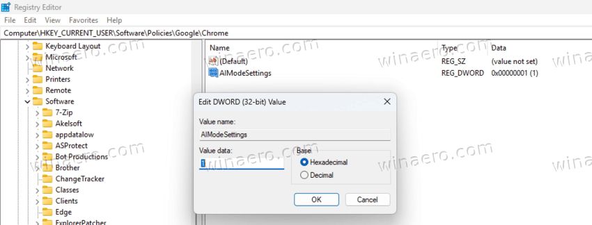 Windows Registry Editor Version 5.0 [HKEY_CURRENT_USER\SOFTWARE\Policies\Google\Chrome] "AIModeSettings"=dword:00000001