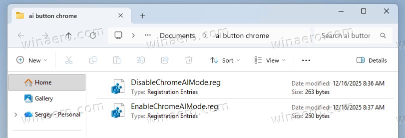 如果用户觉得上述操作步骤较为复杂,可以下载包含两个 REG 文件的 ZIP 压缩包(夸克网盘地址),解压到任意文件夹,然后双击 DisableChromeAIMode.reg 文件,并确认提示以将更改应用到注册表。