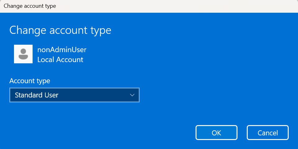 旧版“更改账户类型”对话框用户体验,适用于设备上的其他用户。