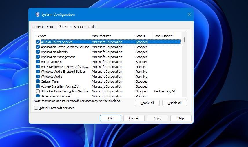 - 请确保您选择了“隐藏所有Microsoft服务”设置,以便从被禁用的服务中排除更重要的服务。