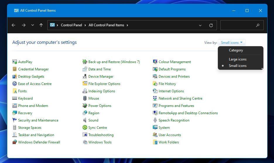 - 打开控制面板,并在“通过”菜单中点击“小图标”。