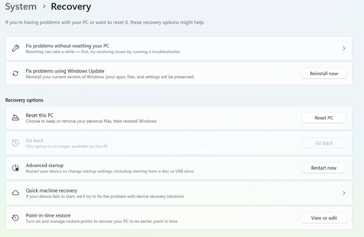 针对系统维护与账户管理场景,微软在交互视觉和逻辑上,升级“时间点还原”功能。本地管理员在启动该功能后,不仅能直观看到设备上所有可用的还原点列表,还能在专属对话框中直接修改默认还原设置。