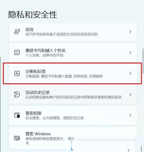 右侧的隐私和安全性下,找到并点击诊断和反馈(诊断数据,墨迹书写和键入数据,定制体验,反馈频率)