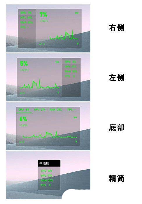 除了默认样式外,Xbox Game Bar(游戏栏)还提供了其他几组外观。同时你也可以点击快捷按钮,隐藏曲线图