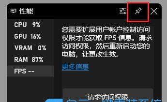 7、如果还没有获取FPS权限,那么点击FPS,再点击请求访问权限,最后重启电脑,就可以打开显示FPS了;